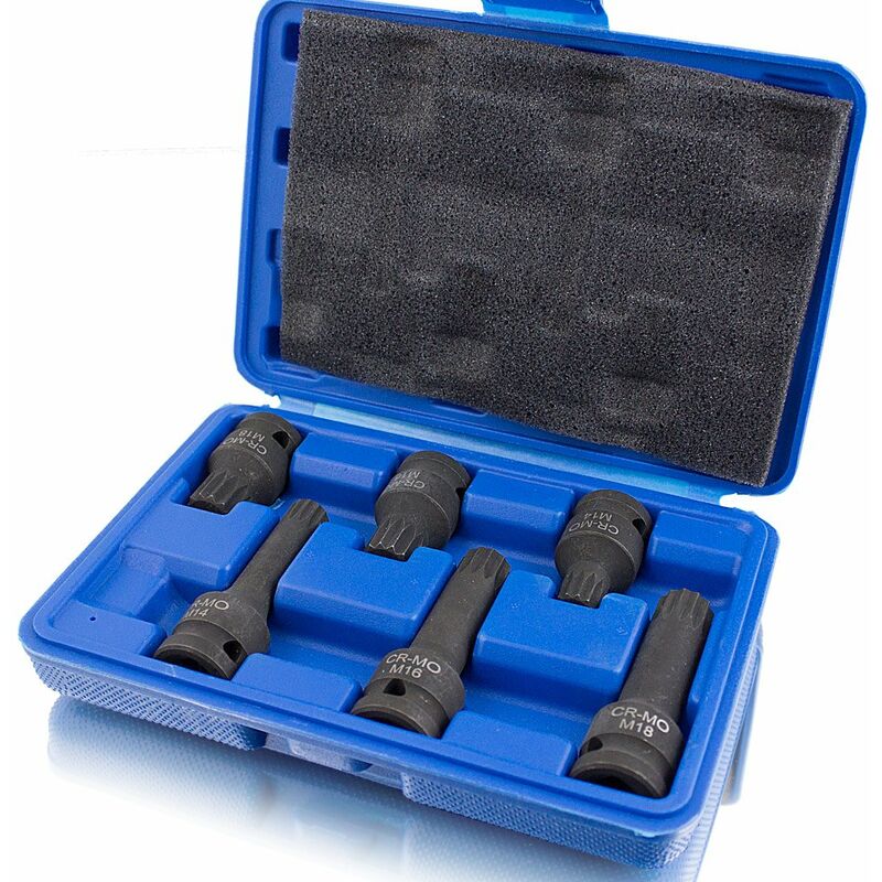 Chiavi a bussola poligonali (XZN) con attacco da 1/2, realizzate in acciaio al cromo molibdeno di alta qualità industriale. Perfette per l'uso quotidiano in officina con l'avvitatore pneumatico a impulsi. Dettagli tecnici: Attacco da 1/2 pollice. Materiale: acciaio al cromo molibdeno. Tensione: 0,8 kg. Contenuto della confezione: 3 bussole da M14, M16, M18 lunghe 45 mm. 3 bussole da M14, M16, M18 lunghe 78 mm. 1 scatola di plastica.