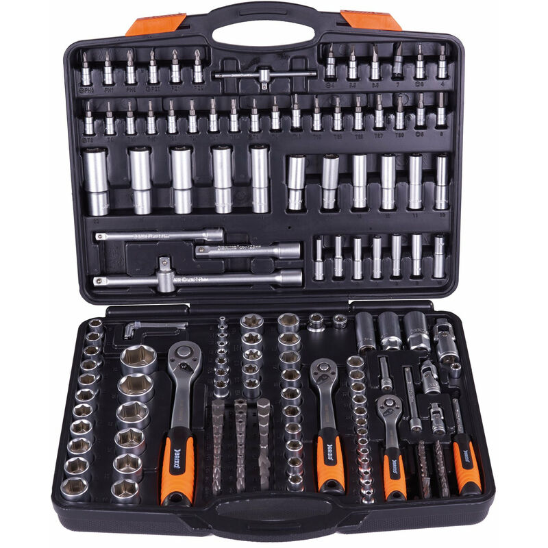 Set 171 pezzi in acciaio chrome vanadium, finitura satinata: Attacco 1/2. Bussole: 10,11,12,13,14,15,16,17,18,19,20,21,22,24,27,30,32 mm. Bussole E20, E24 Bussole profonde: 16,17,18,19,22 mm. Cricchetto 72T Prolunghe per bussole 125 mm., 25 mm. Raccordi universali Adattatori a 3 Vie Chiavi per candela 16 mm., 21 mm. Portainserti 10 mm. Inserti 8 mm. Bits 30 mm.: TX 40,45,50,55,60,70 mm.;