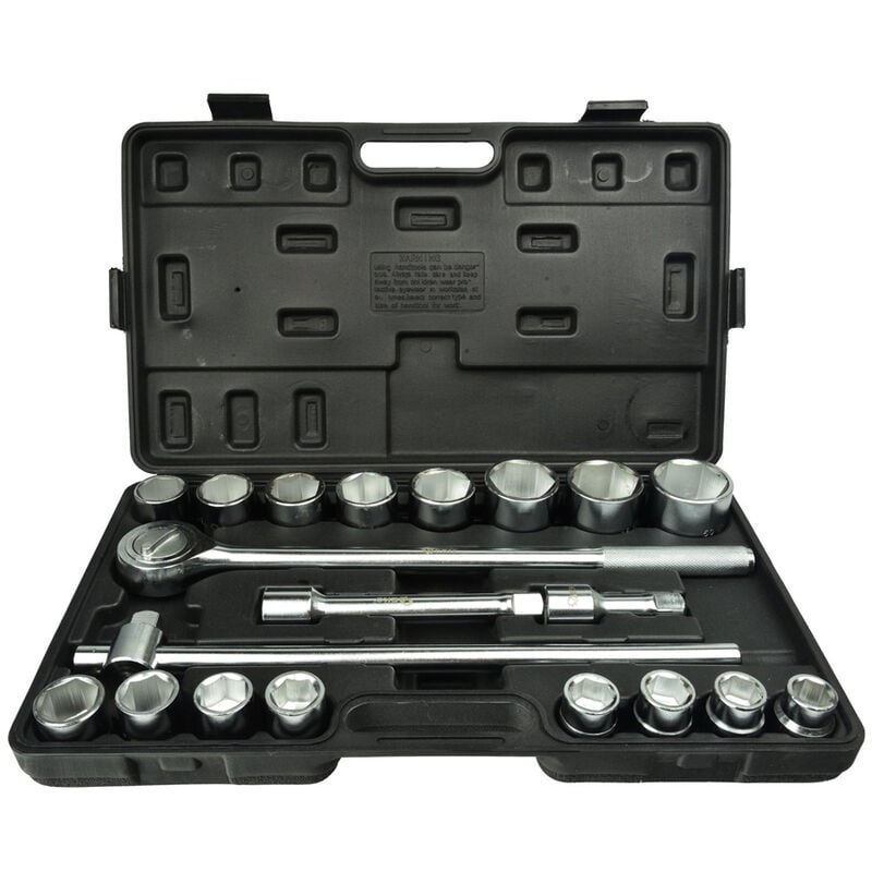 Set di chiave a bussola particolarmente indicato per manutenzionecamion, trattori, automezzi particolarmente pesanti in genere.Kit composto da n.16 bussole al chrome vanadium.MISURE: 19 mm - 21 mm - 22 mm - 23 mm - 24 mm - 26 mm - 27 mm - 30 mm 32 mm - 34 mm - 36 mm - 38 mm - 41 mm - 46 mm - 48 mm - 50 mm -1 cricchetto reversibile 488 mm -1 chiave scorrevole a T 456 mm -2 prolunghe 100 mm e 200 mm Il tutto contenuto in cassetta di plastica chiudibile. Prodotto di qualità. LA FATTURA VIENE EMESSA PER IMPORTI SUPERIORI A € 20 E VA RICHIESTA AL MOMENTO DELL'ACQUISTO