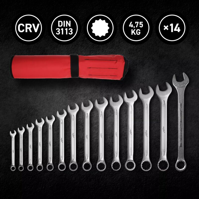 Contenuto Chiavi combinate: 12 | 13| 14| 16| 17| 19| 21| 22| 24| 27| 28| 30| 32| 36 Set da 14 pezzi, contiene le misure di chiavi combinate più diffuse. Realizzato in acciaio CrV al cromo-vanadio di alta qualità. Molto resistente, realizzato con precisione secondo la norma DIN 3113 dell'Istituto tedesco di standardizzazione, dimensioni metriche. La testa dell'occhiello è inclinata di 15 gradi, la testa della forcella è inclinata di 15 gradi. Funzionerà bene in qualsiasi officina per la riparazione di autovetture, camion, macchine agricole, trattori e trattori. L'impugnatura ergonomica e la testa compatta garantiscono la massima funzionalità. Perfetto quando l'accesso alle viti è difficile. Robusta copertura avvolgibile con Velcro 620 450 mm con fori per appendere.