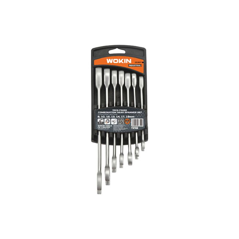Chiavi combinate a cricco fisso serie 151807 wokin Mm 8/19 cf=pz 7 in acciaio al cromo vanadio, cromate, con finitura satinata. serie mm. 8, 10, 12, 13, 14, 17 e 19. con supporto compatto in plastica resistente ed appendibile.