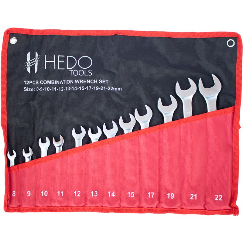 Un set di chiavi a forchetta HEDOTOOLS (12 pezzi) da 8 a 15 mm17 mm19 mm21 mm22 mm Copertura robusta: il set è confezionato con un foglio speciale che consente di raggruppare le chiavi in base alle dimensioni.
