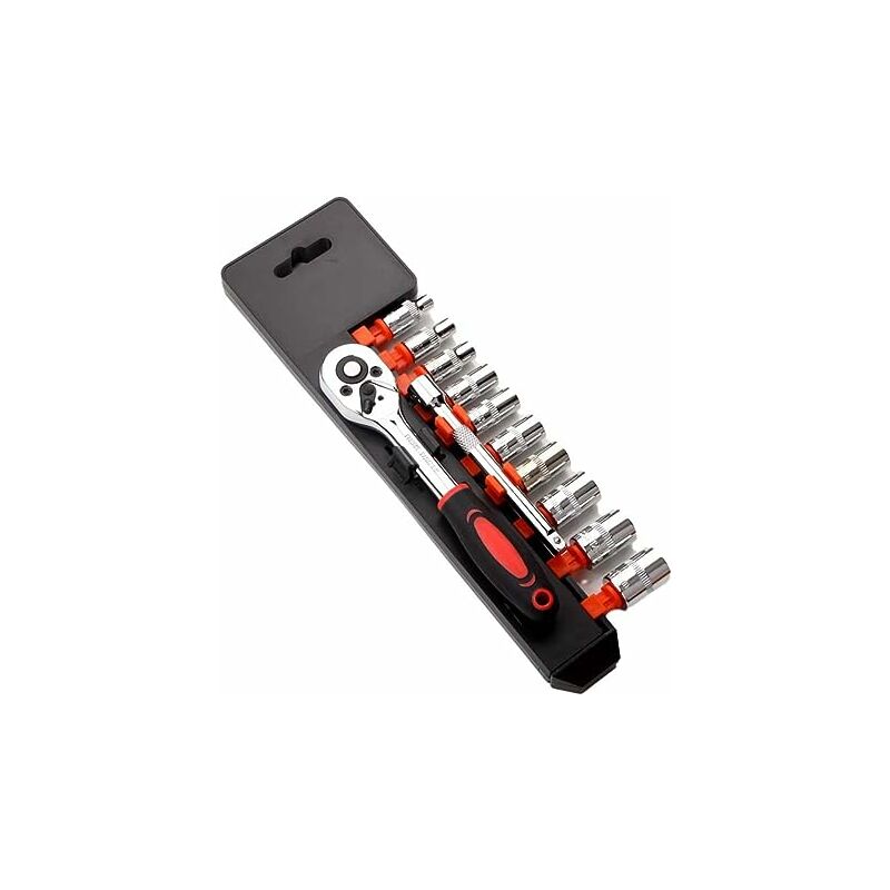 Robusto e durevole: i nostri set di chiavi reversibili, prolunghe e bussole sono realizzati in acciaio al cromo-vanadio di alta qualità, con una perfetta finitura cromata per un'eccellente resistenza e resistenza all'usura. Impugnatura a cricchetto professionale: l'impugnatura a cricchetto ergonomica offre uno sgancio rapido per di invertire l'interruttore, conferendo al prodotto una durata eccezionale. Include 10 prese Cr-V 4, 5, 6, 7, 8, 9, 10, 11, 12, 13 mm, 10 rack di raccolta, ogni presa è dimensionata per facilitare uso e organizzazione.Palo di prolunga: asta di prolunga in acciaio al cromo vanadio da 100 mm, ideale per lavorare in luoghi difficili da raggiungere Ben confezionato: il set viene fornito con un ripiano in plastica per tenere tutte le tue catture organizzate senza ingombro. Non ti perderai mai più. Ideale per casa, falegnami o falegnami, muratori, officine di garage, meccanici, hobbisti, bricolage.