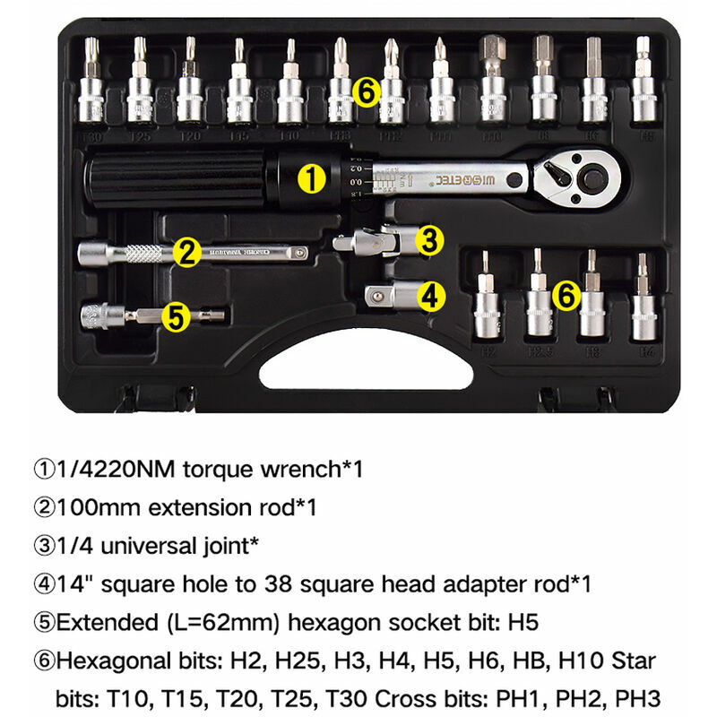 È uno strumento molto utile nella tua vita quotidiana, ha una precisione fine, una sovrapposizione fine e un'ampia gamma di applicazioni, utilizzando acciaio al cromo vanadio e con finitura di grado industriale, questo rende il prodotto ha una lunga durata, tu puoi usarlo per riparare la tua bici e moto, vai avanti e provalo, non ti deluderà. Caratteristiche: Varie combinazioni, non c'è bisogno di ripetere l'acquisto, risparmiando spazio e denaro. Il prodotto ha una presa comoda, una sensazione sottile, sicuro e comodo da usare. La configurazione è ricca e completa, che può adattarsi alla maggior parte dei bulloni con una piccola coppia. La chiave dinamometrica adotta la tecnologia di produzione di precisione e ha le caratteristiche di alta precisione. Ogni chiave dinamometrica con il numero univoco, che può darti una migliore esperienza di utilizzo. I prodotti sono tutti in una scatola, quindi puoi portarlo facilmente con te e usarlo dove vuoi. Specifiche: Materiale: acciaio al cromo