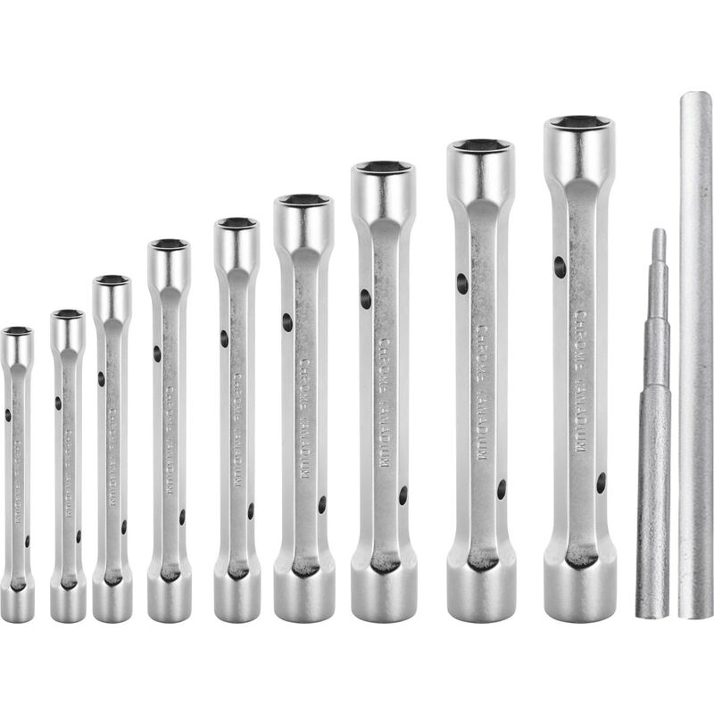 21×23 Spina di manovra n. art. 621600: Dim. 10×200 Spina di manovra n. art. 621800: Dim. 175 Dati tecnici Processo di produzione forgiate Superficie cromato Tipo di prodotto Chiave a bussola Materiale Acciaio al cromo-vanadio Numero chiavi 9 Profilo di manovra Bussola con bocca esagonale