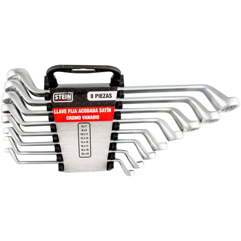 Set chiavi inglesi piegate STEIN in acciaio satinato di alta qualità. Design con anello largo per migliorare la presa. Bocche lucide e rettificate ad alta resistenza. li> Chiave a stella inclinata a 75°. Pratico espositore appendiabiti in plastica.