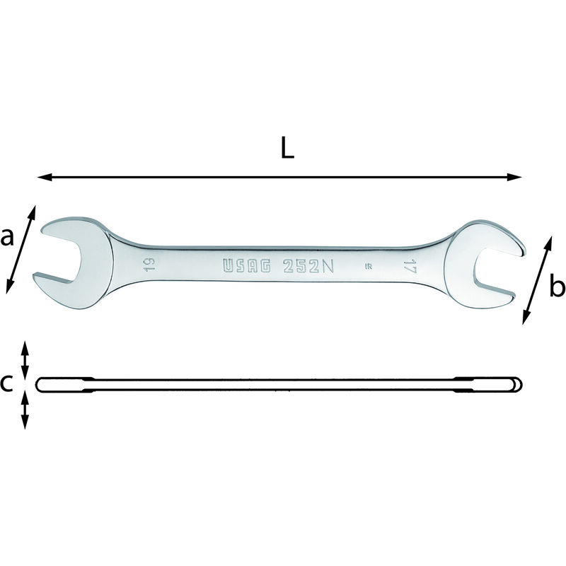 CHIAVI A FORCHETTA DOPPIE Forchette inclinate di 15° Acciaio al Cromo Vanadio Esecuzione cromata Codice Bocca esagonale mm a mm b mm c mm L mm U02520536 19x22 48,5 43 7,5 242 U02520538 20x22 48,5 43 7,5 242 U02520539 21x23 52 47 8,3 242 U02520540 22x24 52 47 8,3 242