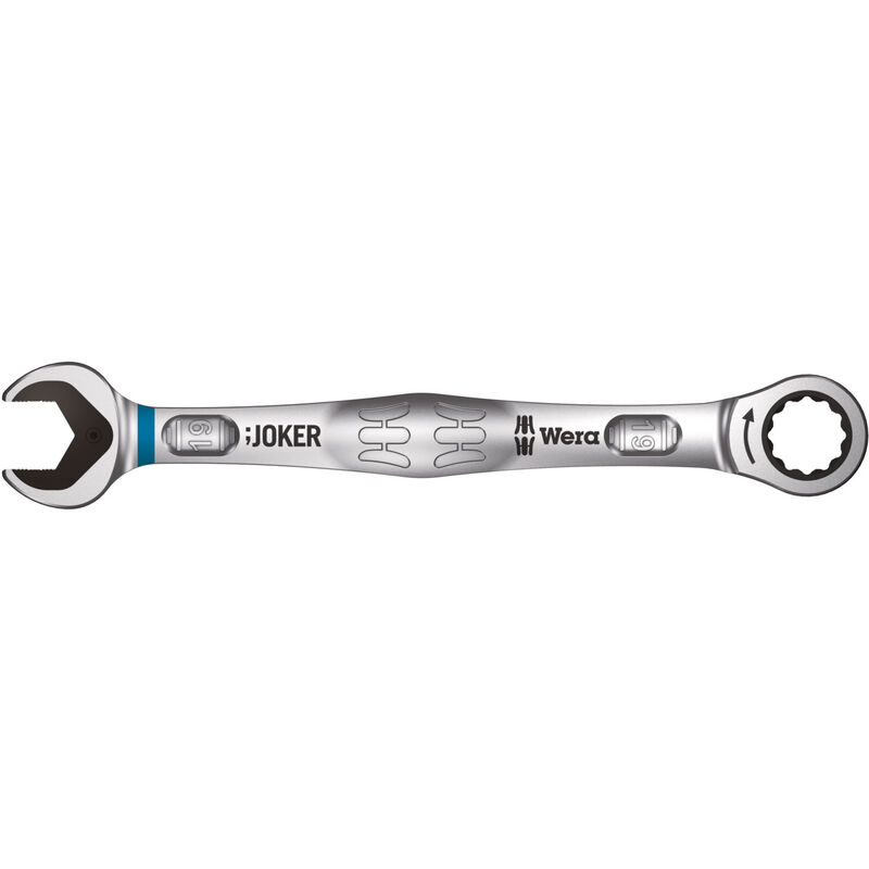 Forgiate. Lato anello con cricchetto a dentatura fine (80 denti) facilmente reversibile con angolo di registro particolarmente stretto (4,5°). Il lato della bocca con profilo esagonale doppio e inserto metallico temprato intercambiabile ha funzione di fermo, funge da finecorsa, impedisce lo scivolamento e permette il serraggio con un angolo di serraggio ridotto. Materiale: Acciaio al cromo-molibdeno, cromato opaco. Dati tecnici Materiale Acciaio al cromo-molibdeno Cricchetto reversibile no Numero di denti 80 Angolo di registro Grad 4.5 Processo di produzione forgiato Superficie es. opaca cromata Posizione anello Grad 0 Tipo di prodotto Chiave Apertura, mm 19 Lunghezza chiave L, mm 246 Denominazione originale prodotto 6000 Joker Dimensione apertura Metrica Apertura bocca b, mm 42 Altezza bocca h1, mm 9,5 Altezza anello h2, mm 11 ⌀ Anello D, mm 34,8