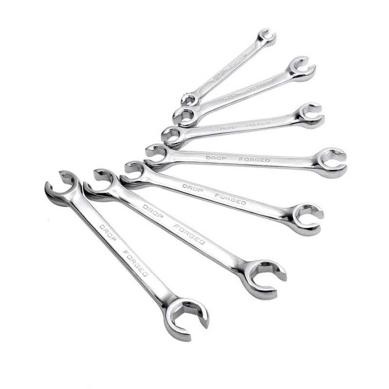 SET 7pz CHIAVI POLIGONALI APERTE DOPPIA DIRITTA Utilissimo kit Realizzate in acciaio crome vanadium Bocche aperte per la manovra di raccordi di impianti idraulici, oleodinamici ed aria compressa. Misure:mm 6x8 9x11 10x12 13x14 15x17 16x18 22x24
