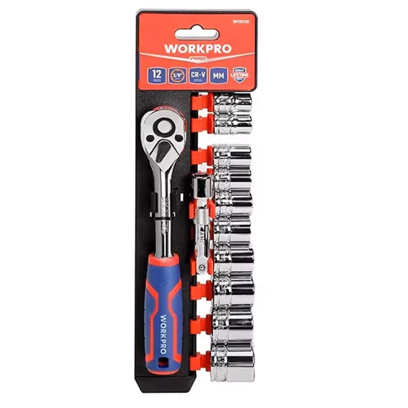 Set de 12 chiavi de presa de 3/8 workpro. set de prese cr-v. 10 prese dr. de 3/8: 10, 11, 12, 13, 14, 15, 17, 19, 21, 22 mm. 1 barra de prolunga dr. de 3/8 x 3. 1 presa dr.de 3/8 maniglia de cricchetto. cromato opaco