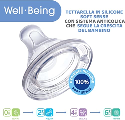 Chicco - Set di bottiglie anticoliche in blu, anti coliche, confezione da 4 pezzi, dalla nascita fino a 6 Mo.Mama, tettarella in silicone 0 m + & 2 m+, 2 x 150 ml e 2 x 240 ml, Made in Italy