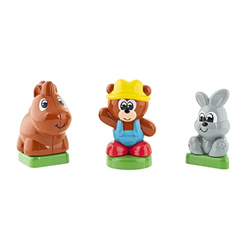 6 personaggi animali: include 6 divertenti e colorati personaggi della fattoria con base sagomata (triangolo, quadrato e cerchio): taddy, mucca, gallina, cavallo, coniglio e anatra