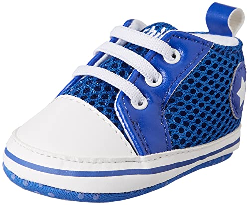 Scarpina nursery Chicco blu in tessuto forato con stella applicata sul fianco.