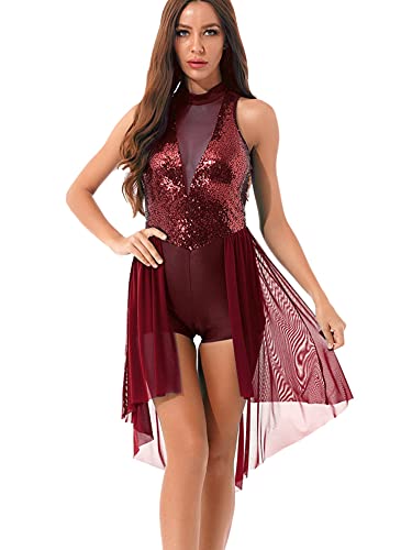 CHICTRY Abito da Pattinaggio Artistico Donna Paillettes Vestito Danza Classica Chiffon Leotards Abito da Ballo Latino Ballerina Salsa Jazz Samba Rumba Danza Moderna Borgogna XL