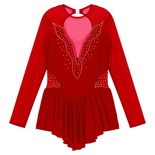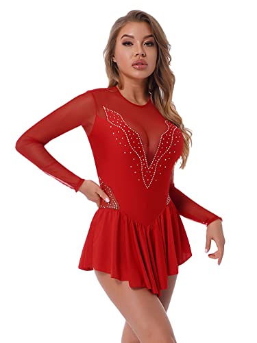 CHICTRY Ragazza Donna Vestito Danza Classica con Strass Manica Lunga Vestito Pattinaggio Artistico Balletto Body Ginnastica Schiena Scoperta Leotard Abito da Ballo Dancewear Rosso L L