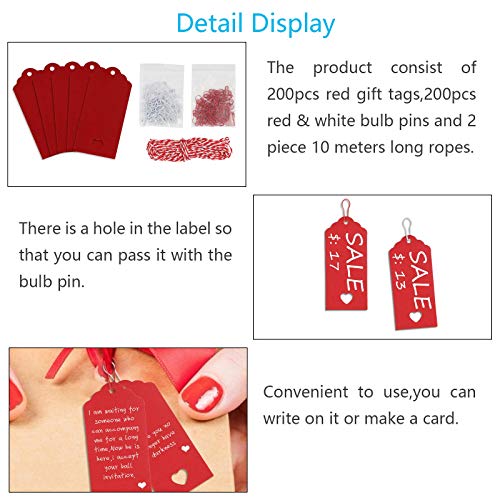 Fatto a mano:Il set di etichette in carta kraft rossa include 200 pezzi di etichette regalo rosse,200 pezzi di lampadine in bianco e nero e 2 corde lunghe 10 m.C'è un piccolo cuore d'amore sull'etichetta che può essere rimosso,potrebbe fare una grande aggiunta al tuo mestiere scatola.
