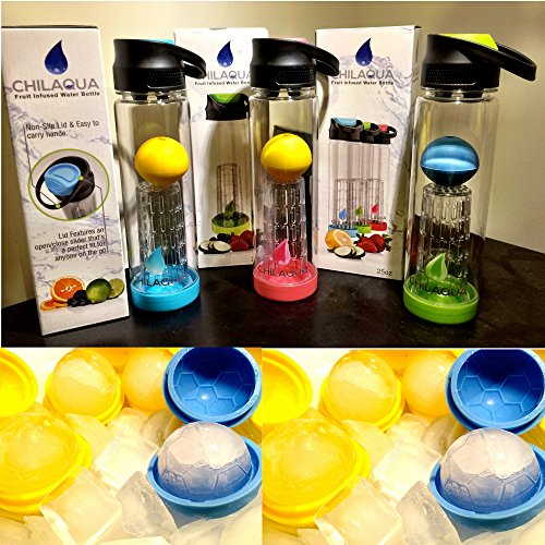 WHAT YOU GET - Chilaqua Fruit infuser water bottle, Foot-ball shaped 1" diameter silicone ICE BALL MAKER, 24 pages Infused water Recipes Ebook.