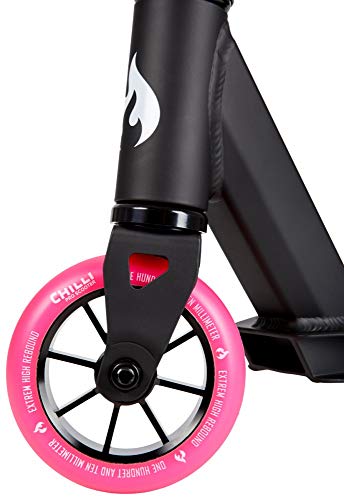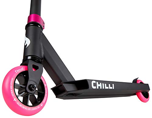 Chilli Base è il monopattino per principianti per ogni principiante. Questa variante si presenta in nero e rosa.