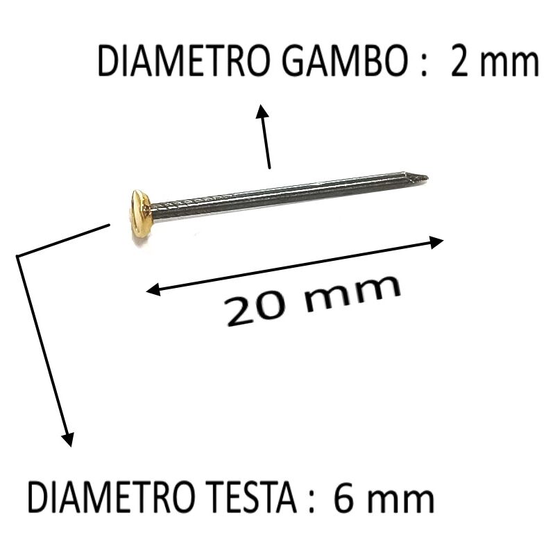 Confezione composta da 100 Chiodi di diametro 2 mm per una lunghezza totale di 20 mm, in Acciaio trattamento antiruggine, con testa bombata ricoperta in Ottone . Utilizzati principalmente per fissare Quadri sul muro, ma essendo in Acciaio sono anche molto impiegati per fissaggi in cemento, mattoni, legno duro ecc .. DATI TECNICI: - Lunghezza totale 20 mm - Diametro gambo 2 mm - Diametro testa 6 mm - Confezione da 100 Pezzi