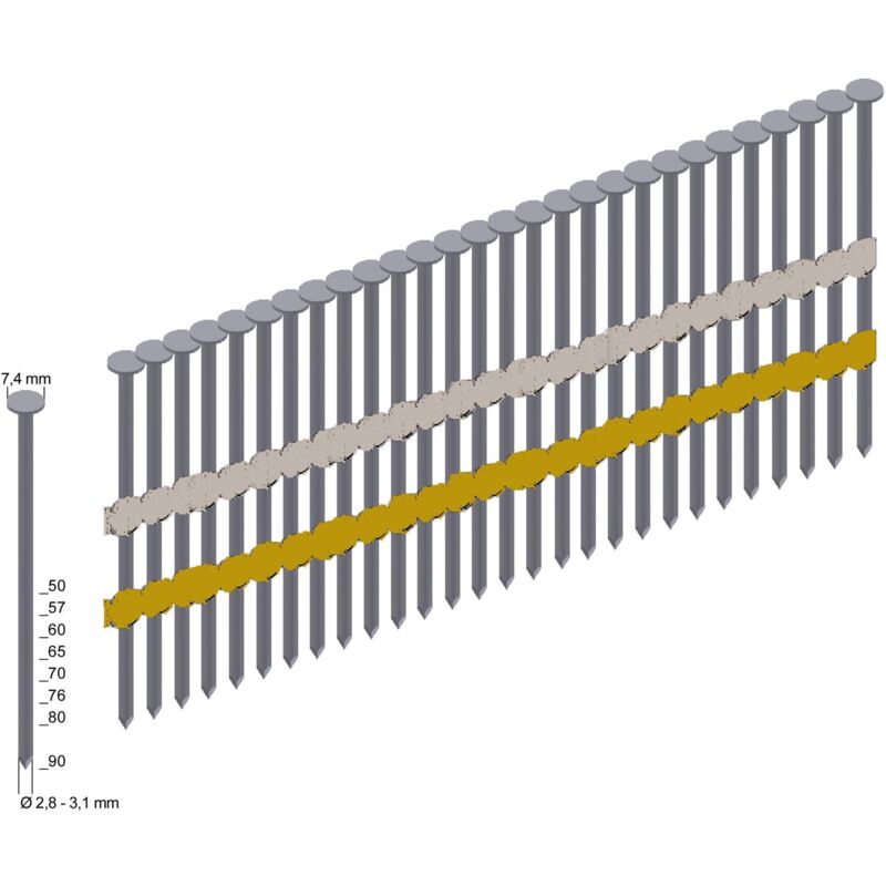 Chiodi per strisce Tipo RK31/70BK Gambo liscio Lunghezza chiodo 70 mm Dimensione del filo Ø 3,1 mm Versione Caricatore in plastica Pezzi/scatola 3.000 Peso per scatola 13.5 kg Unità di imballaggio 1 x 3.000 -- I chiodi a nastro Prebena RK (chiodi a testa tonda) da 50 a 160 mm - dimensione del filo: 2,9 - 4,6 mm - caricatore in plastica - inclinazione 20° sono compatibili, tra gli altri, con i seguenti dispositivi o sistemi: BeA - R 20 Bostitch - KN Bostitch - PL 21° Dewalt - chiodi a striscia ST 20° Duofast - Chiodi a striscia SN Haubold - RB 29/50 - RB 50/160 Hitachi - Chiodi a striscia ST 20° Holzher - Chiodi a striscia Mafell - Chiodi da 2,7x55 a 3,4x100 Max - Chiodi a striscia ST 20° Paslode - Chiodi da magazzino in plastica dura Powerfix - ST 20 Schneider - RN 29/65 - RN 34/100 Senco - Chiodi a striscia MC/OC Würth - Chiodi a striscia 20 I chiodi PREBENA a gambo liscio sono conformi alla norma DIN 1052 Parte 2 (resistenza alla trazione del filo del chiodo, diametro della testa