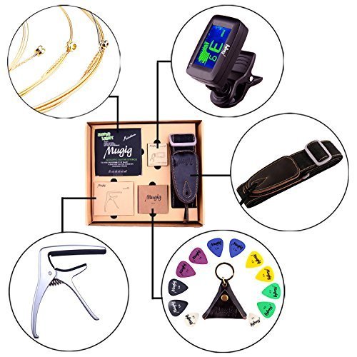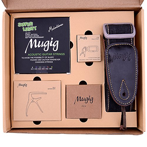 Chitarra Accessori Set Mugig, Accordatore Cromatico con Batteria, 12 Pezzi di Plettri con Custodia di Pelle, Corda Acustica, Capotasto, Tracolla Regolabile