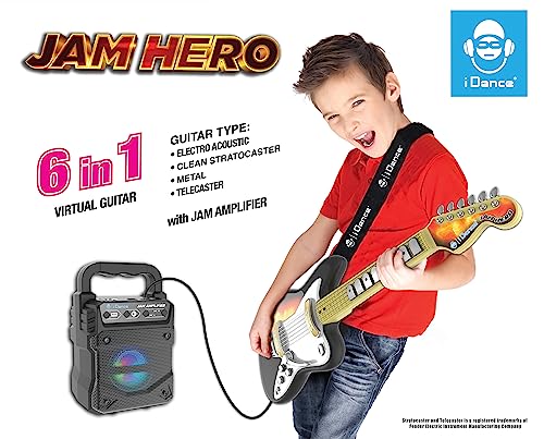 Cefa Toys - Chitarra elettrica con amplificatore Jam Hero, con 4 tipi di chitarra, acustica, Stratocaster, Telecaster e metallo, include luce, cinturino, amplificatore Bluetooth e ingresso audio