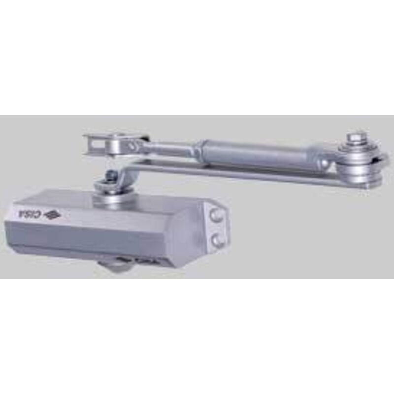 Ideale per controllare in modo efficace, affidabile e a costi vantaggiosi la chiusura della porta. Meccanismo a pignone e cremagliera. Corpo in lega di alluminio. Braccetto in acciaio. Speciale molla in acciaio a bagno d'olio. Regolazione della velocit... di chiusura tramite la valvola 1. Regolazione del corpo finale tramite valvola 2. Forza di chiusura regolabile da EN 2 a 4 variando la posizione di montaggio. Adatto per porte fino a 1100 mm destre o sinistre, a tirare o a spingere. Chiudiporta 'aerei 604' cisa con arresto col. oro CISA Serrature cisa