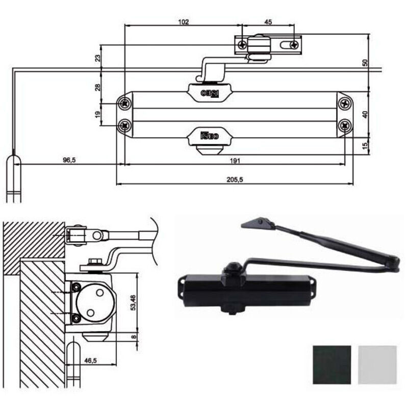 Con braccio a compasso. Puo' essere installato su qualunque tipo di porta, con peso fino a Kg. 80 e larghezza Mm. 950. Apertura 180o. Dimensioni: 205x53x46. Con marcatura 'UL listed', secondo la norma UL10C, che consente l'installazione del chiudiporta anche su porte tagliafuoco fuori dall'Europa.