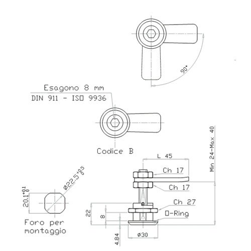 Montaggio: - eseguire foro nel portello come disegno - inserire corpo d.30 con stelo M10 - bloccare dado di ritegno M22 regolare con i due dadi M10 lo spessore di chiusura