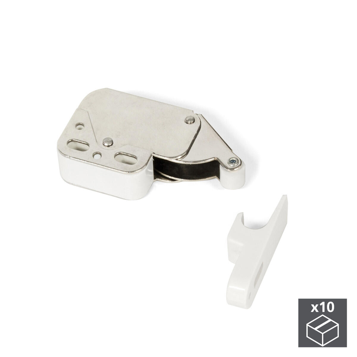 Chiusura silenziosa per mobili. Permette un fermo meccanico unendo l'anta al mobile. Dispone di un sistema di espulsione dell'anta per l' apertura automatica. Possiede un cuscinetto di gomma che mantiene la porta chiusa in sicurezza. Montaggio con viti. Prodotto in acciaio e plastica con finitura bianca.. Emuca Chiusura a cricchetto per mobile, Acciaio, Bianco, 10 u.. La chiusura a pressione Fast Latch per mobili si regola con un fermo meccanico trattenendo l'anta al mobile. Possiede un cuscinetto di gomma che mantiene la porta chiusa in sicurezza. Premendo un sistema di espulsione permette l'apertura automatica dell'anta. Il montaggio si realizza semplicemente avvintando sul mobile e sull'anta il sistema.