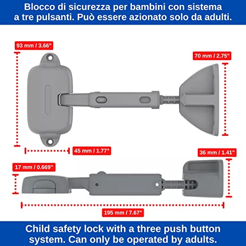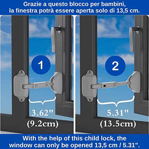 Chiusure sicurezza bambini per finestre, 2 pezzi, Grigio, adesivi speciale, con apertura all'interno o all'esterno, per telai in UPVC, legno, metallo larghi almeno 40 mm, Blocchi ferma finestre