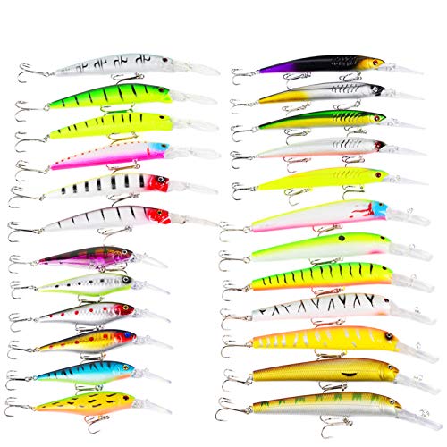 Grande valore e Professionisti: 24 pezzi esche da pesca e accessori. Comprende diversi tipi di esche. Varie dimensioni e design per catturare diversi pesci, come trota, spigola, salmone, ecc. Le esche da pesca è adatto per acqua dolce e salata e tutti gli strati nuoto. Set meraviglioso per il vostro on-the-go battute di pesca.