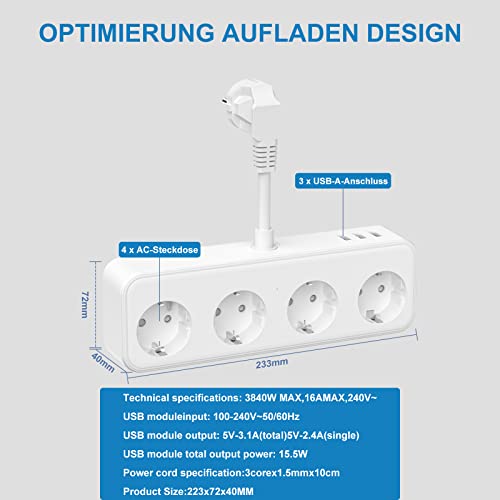 【Design di ricarica ottimizzato】: questa presa USB utilizza tecnologie avanzate per ottimizzare ogni ricarica. Presa AC: max. Potenza fino a 3840 Watt (massimo 240 V, 16 A). Tensione di ingresso delle porte USB: 100 V - 240 V AC, 50/60 Hz, uscita USB: 5 V/3,1 A (totale), 5 V/2,4 A (porta singola). Può rilevare automaticamente il dispositivo e distribuire l'elettricità.