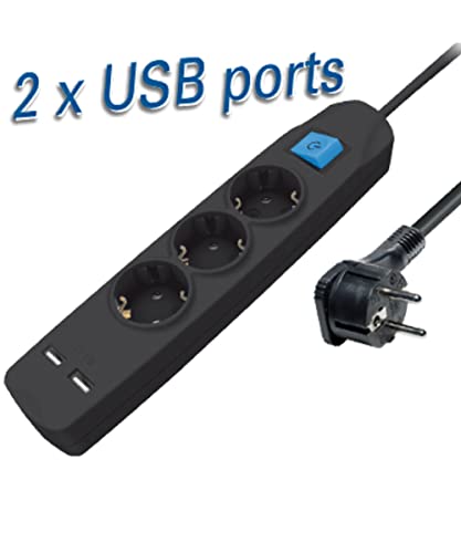 Ciabatta elettrica a 3 scomparti con 2 prese di ricarica USB e spina piatta, con interruttore (presa con maggiore protezione da contatto), 5 m, colore: nero