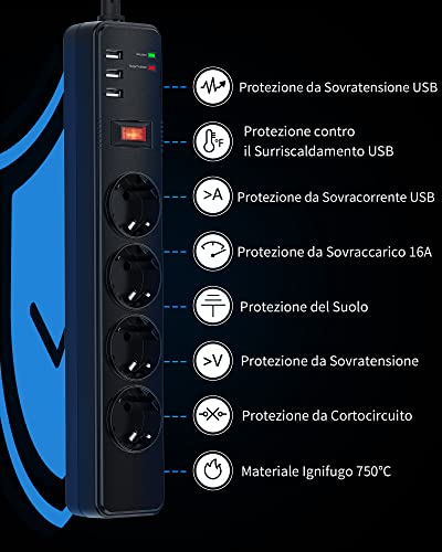 【4 Prese Schuko & 3 Porte USB】La multipresa con usb è progettata per supportare 110V-250V. 4 prese da 16A e 3 porte USB forniscono alimentazione a tutti i dispositivi. La multipresa può riconoscere automaticamente i tuoi dispositivi in modo intelligente e fornire la corrente più veloce possibile fino a 2.4A per porta USB, 3.1A in totale. Molto adatta per la casa e l'ufficio.