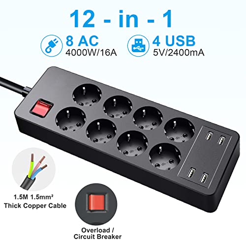 Ciabatta Multipresa con USB 8 Posti,Multipresa Ciabatta Elettrica Protezione Sovratensione con Interruttori 8 Presa e 4 USB Universali Tedesca Spina Schuko 1.5M Cavo 250V/4000W,Nero [Classe A]