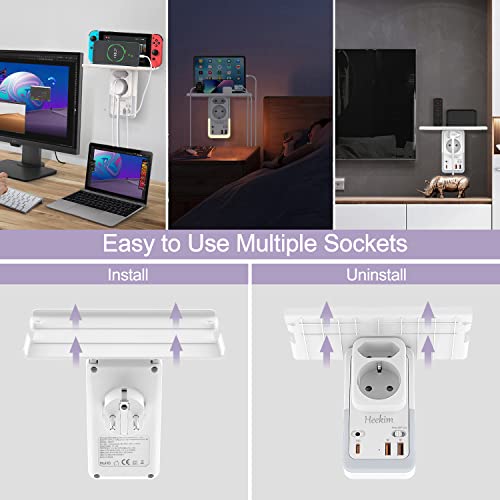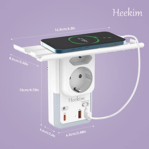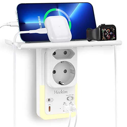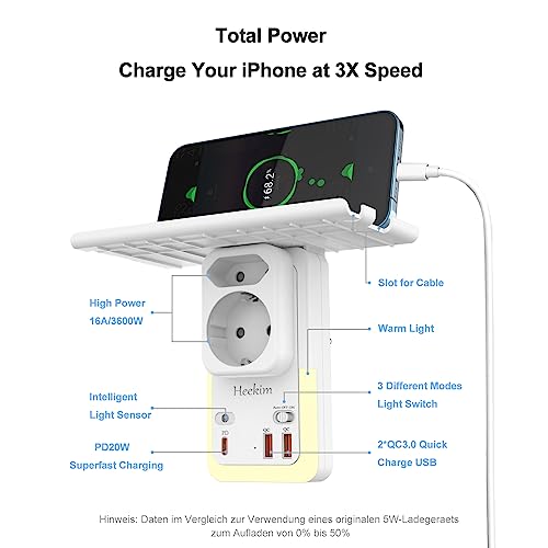 【7 in 1 Design】Basta collegare l'adattatore di presa di corrente Heekim a qualsiasi presa di corrente standard dell'UE e si espande a 1 presa di corrente Schuko, 1 presa di corrente dell'UE (3600W/16A), 2 porte di ricarica USB (5V/QC3.0) e 1 porta PD 20W di tipo C (carica il tuo Telefoni Cellulari a Velocità 3x). Inoltre, la spina è dotata di una luce notturna a sensore e di un supporto.
