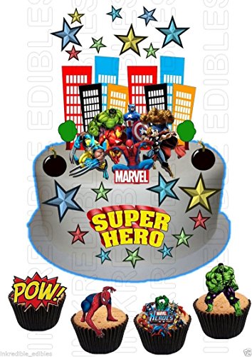 Cialda commestibile per dolci, da usare come decorazione per torte di compleanno o cupcake, raffigurante supereroi come Hulk, Spider Man e Iron Man (lingua italiana non garantita)