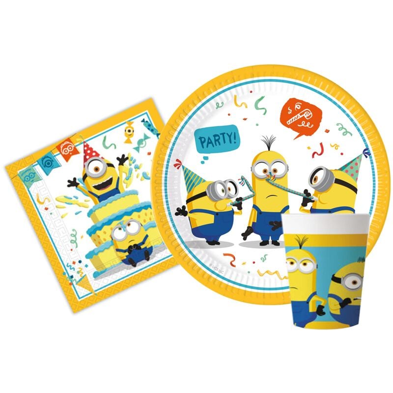Descrizione Descrizione Prodotto originale licenziato Minions. Contenuto: 24 piatti Ø23cm, 24 bicchieri 200ml, 40 tovaglioli 33x33cm. Occasioni: Compleanni, party, feste a tema, anniversari, celebrazioni, festeggiamenti, allestimenti, composizioni, eventi Avviso di sicurezza Nessun avvertimento applicabile
