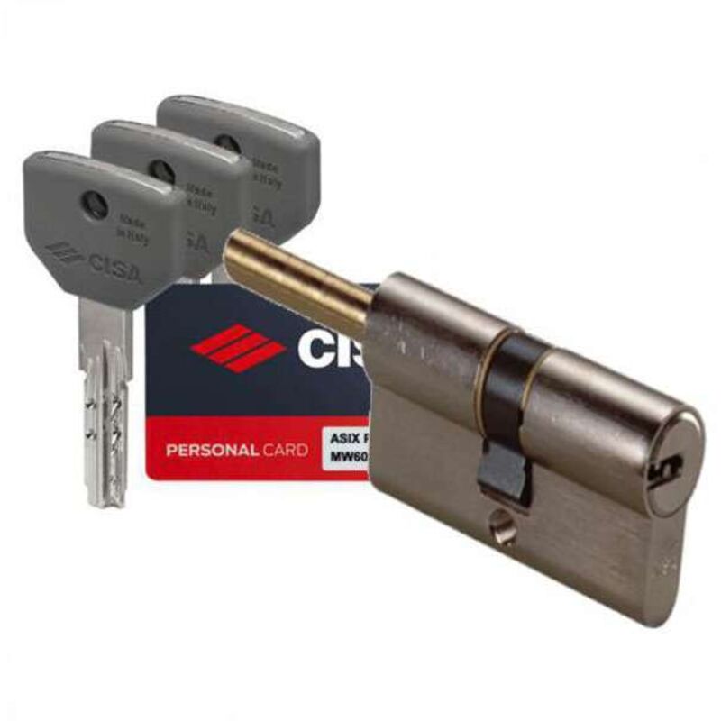 Cilindro ottone nichelato Utilizzo 1 chiave e 1 pomolo Sistema a 6 perni attivi + 2 passivi Perni econtroperni acciaio carbonitrurato Camma acciaio sinterizzato Molle bronzo fosforoso e acciaio Protezione antitrapano BKP resistente Bumping brevettodepositato 3 chiavi Asix 00670-10-0 cod.85663 Duplicazione chiavi con Personal Card