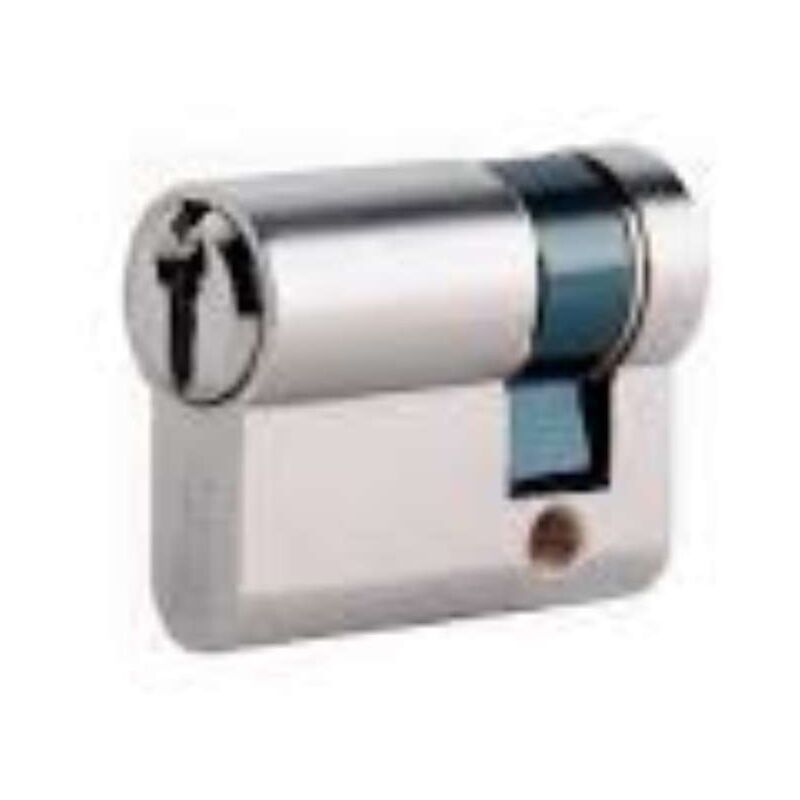 Cilindro F5 MONOPROFILO, chiave 5 spine grande. Camma DIN 8 posizioni. 3 CHIAVI. Vite di fissaggio. (Chiave grezza codice 020259). Materiale: NICHELATO Cod. L (C+D) C D 820930109 40 30 10