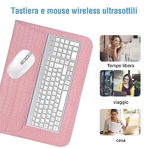 【DESIGN ERGONOMICO】La tastiera wireless, ha tutte le chiavette in una struttura a basso profilo a forbice, che la rende ultra sottile (velocità dei tasti da 2 mm), reattiva e meno rumorosa。La tastiera wireless ha un angolo di inclinazione per l'ottima posizione di battitura