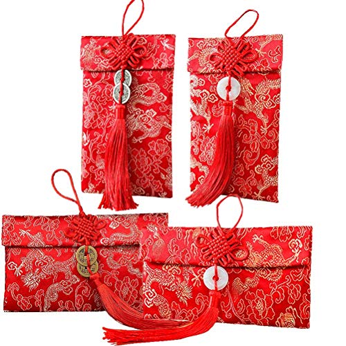 Uoeo 4 pz cinese elemento di seta rosso buste, Lucky Dragon cinese ricamo buste rosse per matrimonio, New Year Red Money tasche, può contenere fino a circa 100 fogli (4 stili)