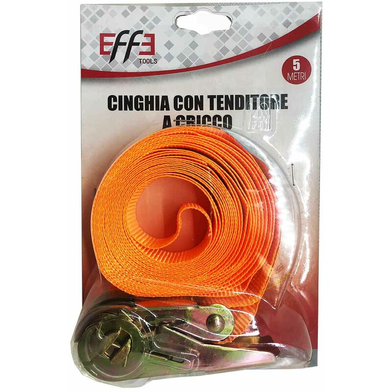 Cinghia Effe da 5 mt con ganci e cricchetto tenditore per l'ancoraggio di materiali, bagagli e la messa in sicurezza di prodotti durante un possibile trasporto o per aumentare la stabilità. Sistema di legatura ad anello, con cricchetto tenditore e nastro in poliestere ad alta tenacità da mm. 25 di larghezza. Rispondente alla normativa EN 12195-2. Portata LC= Kg. 700.