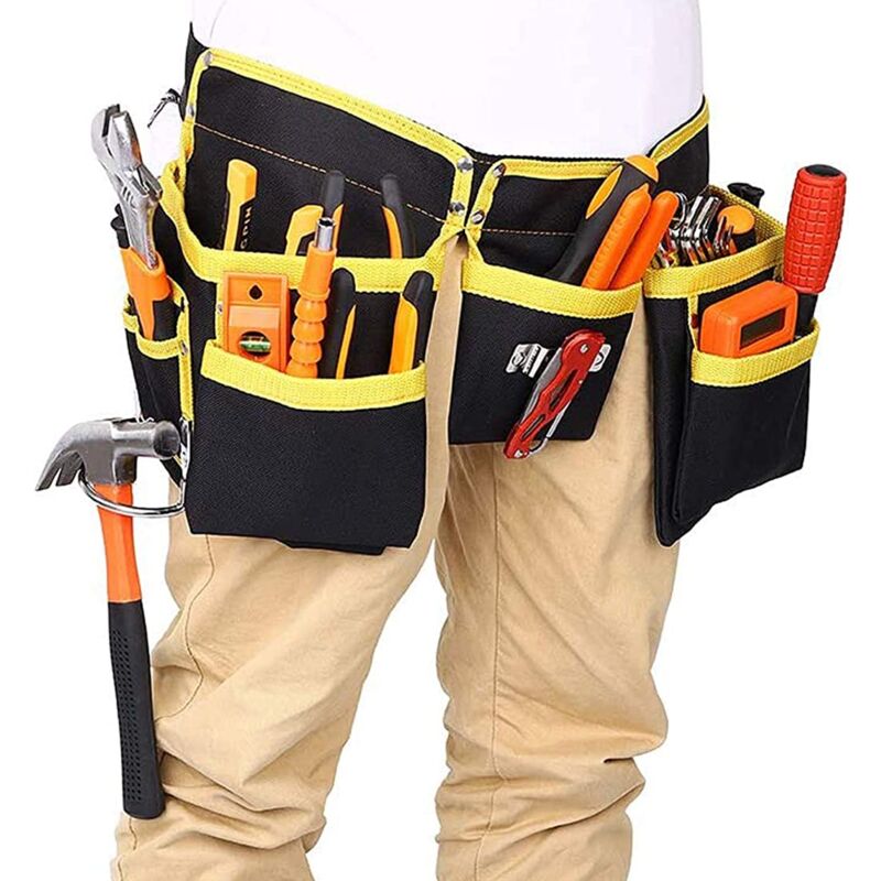 Cintura porta attrezzi con 11 tasche. Materiale: tessuto Oxford premium, durevole e resistente. Cinghie regolabili: La nostra cintura degli attrezzi ha cinghie regolabili. Quindi puoi regolare le dimensioni in base alle tue esigenze. Essendo regolabile, è quindi adatto alla maggior parte delle persone. Dimensioni cintura (L x A): 50 x 24 cm, con cinghie regolabili, per permetterti di regolare la taglia in base alle tue esigenze. Cintura porta attrezzi multifunzione: regalo festa del papà, regalo per uomo, regalo per padre e marito, ideale per elettricisti, carpentieri, artigiani, tecnici HVAC, meccanici, idraulici, cartongessisti, giardinieri, per saldatura e altri. A casa o al lavoro. Cintura con tasche porta attrezzi. Design: aspetto semplice e strati durevoli. Colore principale: nero. Con linee gialle che impreziosiscono la cintura degli attrezzi per renderla elegante e bella. Il regalo perfetto per TE Ideale per fai da te padre marito elettricisti tuttofare Idea regalo: la cintura