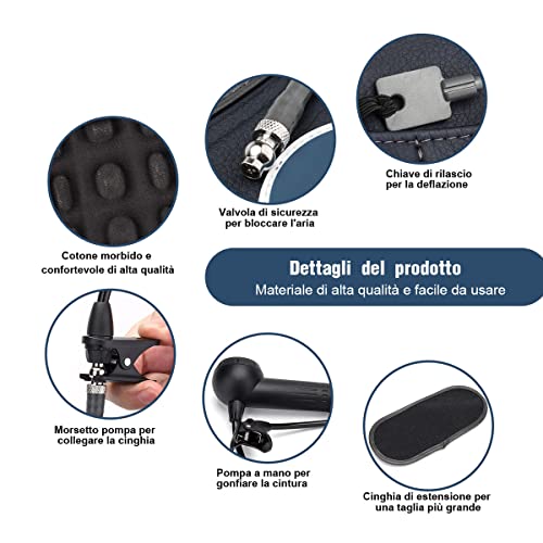 DESIGN UNICO - Dotato di una pompa a mano progettata per prevenire il gonfiaggio eccessivo, rilascerà automaticamente l'aria quando la cintura è completamente gonfia. Non ti preoccuperai mai che la cintura scoppi a causa del gonfiaggio eccessivo. Puoi usare la cintura antidolorifica quasi ovunque nelle tue attività quotidiane, come camminare, sederti, sdraiarti, fare giardinaggio, giocare a golf, lavorare, guidare, ecc.