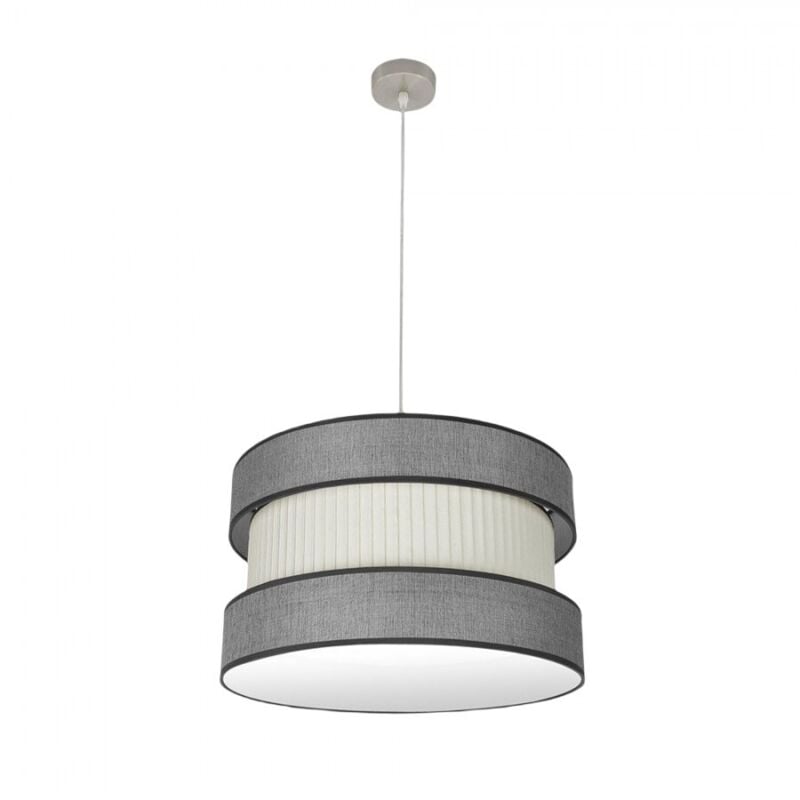 Sospensione di design composta da o tre paralumi della serie HOME in colore NICKEL abbinando paralumi colore GRIGIO/BEIS. Realizzata in metallo e tessuto, in stile moderno, presenta un paralume plissettato centrale e due grigi bordati di grigio scuro alle estremità, risultando in una composizione molto originale e decorativa per illuminare camere da letto, soggiorni, stanze e aree di lavoro. Ha due portalampada E27. Lampadine non incluse. Ha un diametro di 50 centimetri con dimensioni, regolabili in altezza, di 46