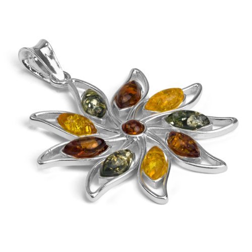 Ciondolo in Argento Sterling con Ambra multicolore Fiore Catena 46cm