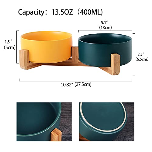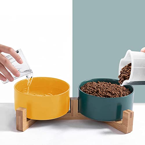 Ciotola per cani in ceramica per gatti con supporto in legno, senza BPA, set da 2 pezzi (verde e giallo)