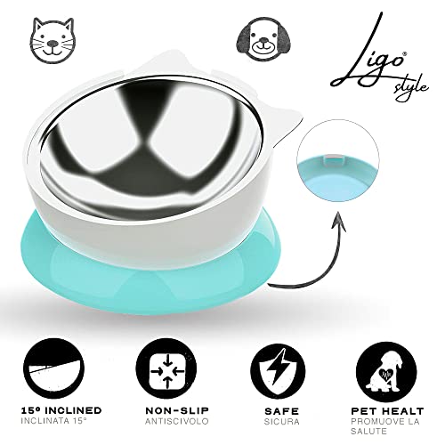 Ligo - ALLY Ciotola per Gatti e Cani di Piccola Taglia,Ciotola inclinata per Cibo Gatto e cane. Riduce la Pressione sulle Vertebre Cervicali del Gatto.Design con orecchie. (AZZURRO)